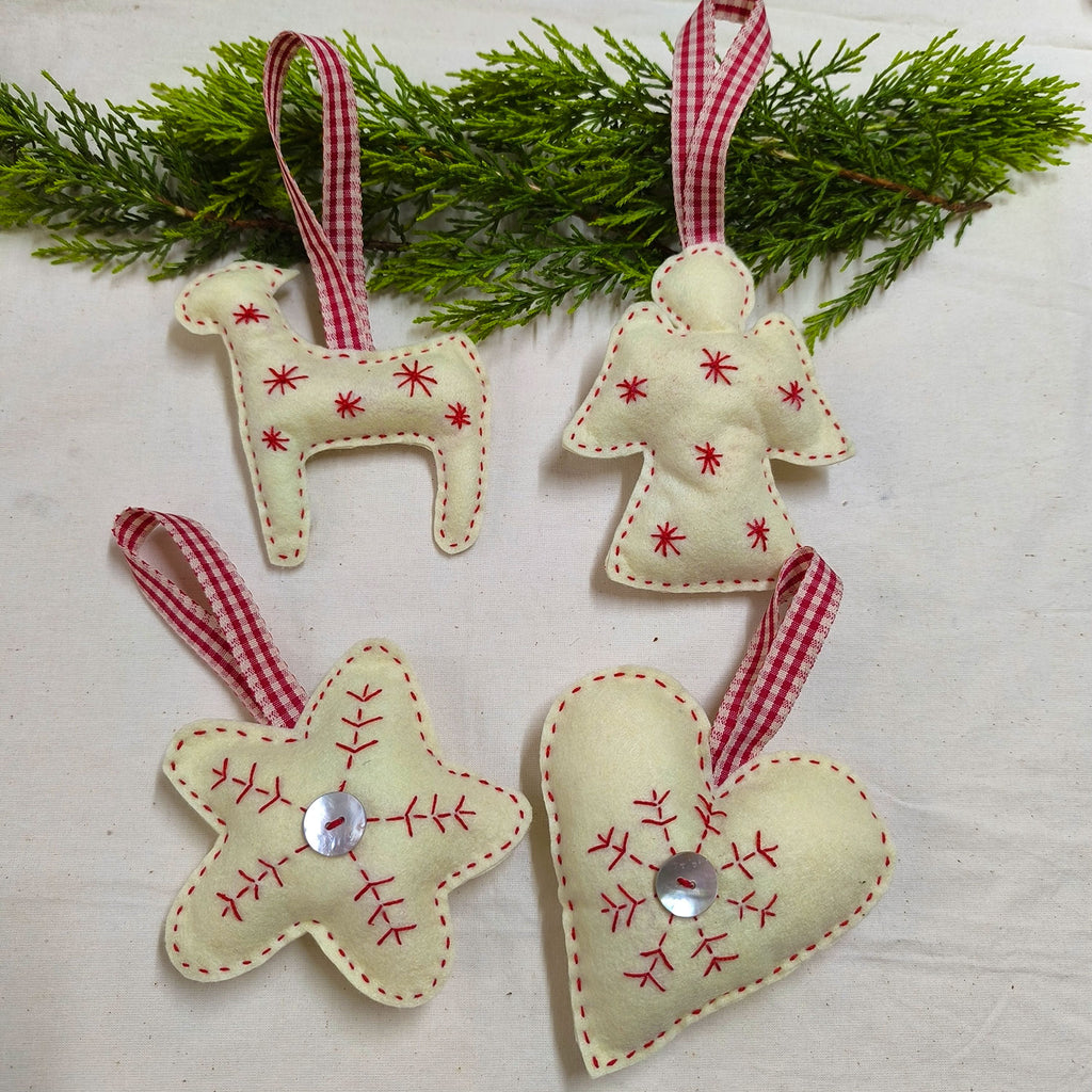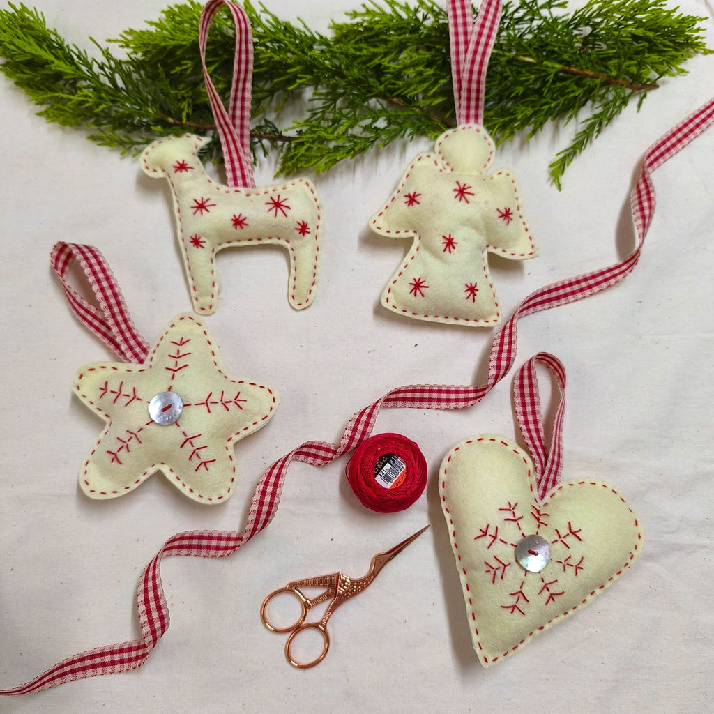 Θα μάθεις να τοποθετείς το πατρόν  στη φετρίνα, να κεντάς και να ράβεις στο χέρι με την πατητή βελονια . ένα αστέρι,  ένα αγγελάκι, μία καρδιά και  ένα ταρανδάκι.