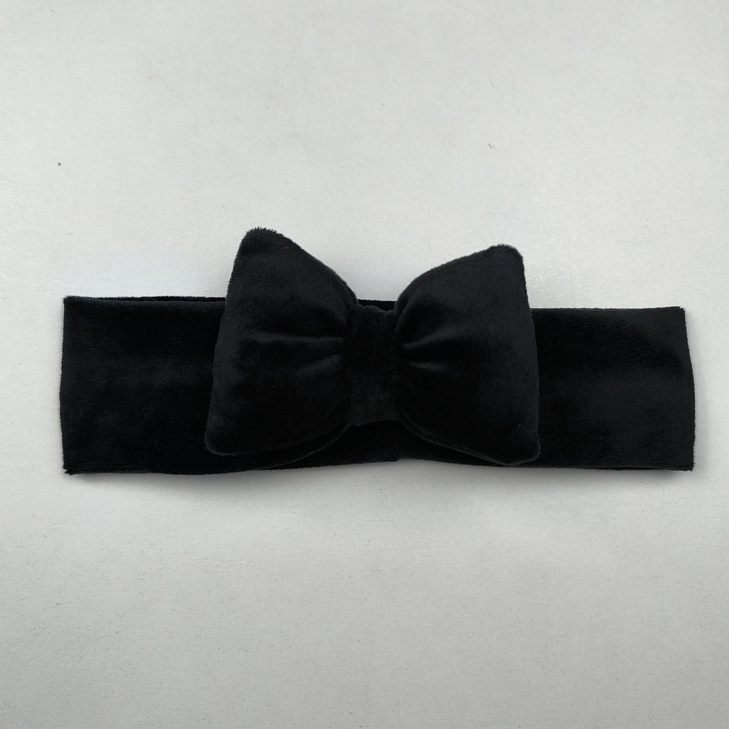 Βρεφική χειροποίητη βελουτέ κορδέλα σε μαύρο χρώμα με ασορτί φουσκωτό φιογκάκι.
